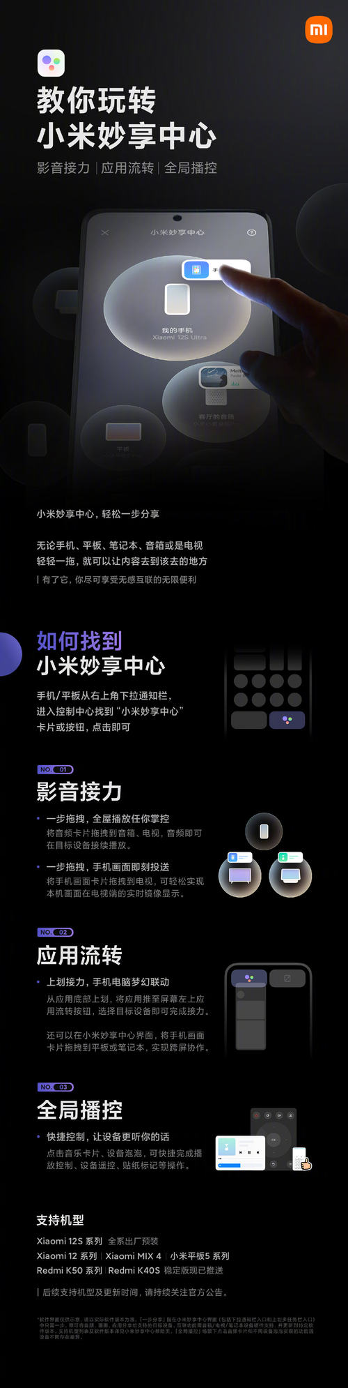 小米妙享中心支持小米12S系列、小米12系列、小米平板5系列,Redmi K50系列|Redmi K40S稳定版已推送,后续支持机型暂未公布。