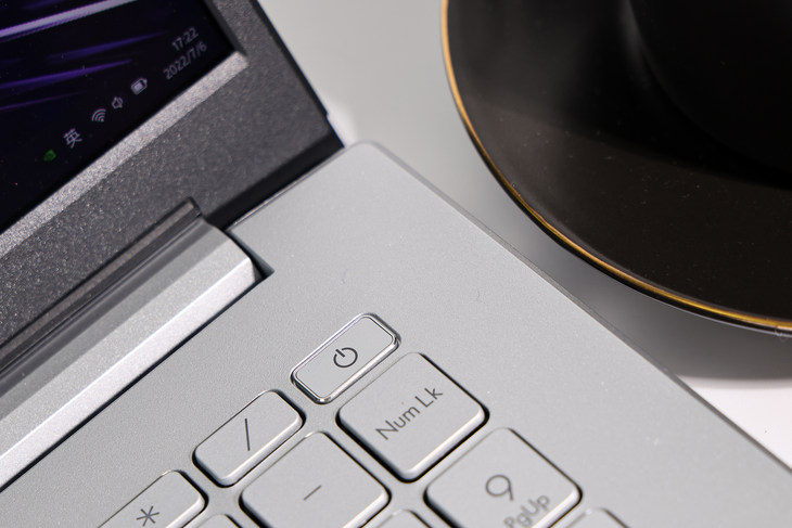 开机键位于键盘面右上角。同时,这枚开机键还集成了指纹识别器,用户利用它可以疾速解锁电脑。