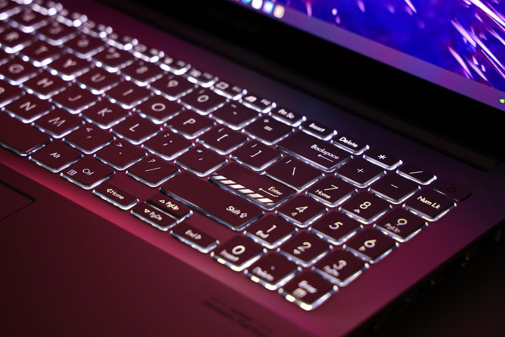这款轻薄本采用了白色背光键盘设计。白色背光支持熄灭以及三档背光强度调节。