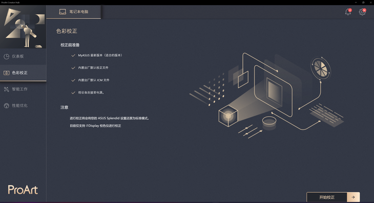 利用ProArt创作者中心,可以对这款轻薄本进行屏幕的色彩校正。
