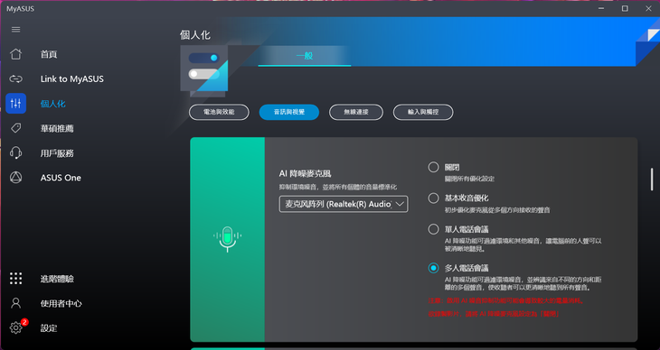 华硕无畏Pro15 2022支持AI降噪功能。利用华硕独家的AI降噪软件,可以对3.5mm音频插孔、USB或蓝牙等任何类型的耳机或麦克风进行语音对话降噪,进而带来清晰的视频通话效果。
