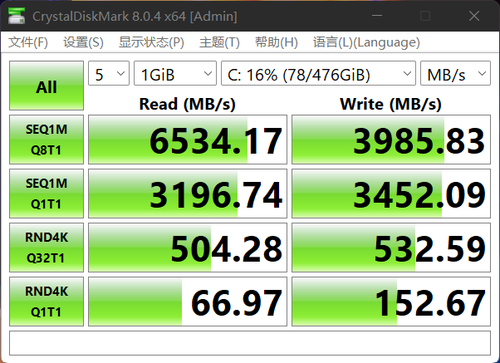 通过CrystalDiskMark这款测试软件的成绩来看,这块SSD的性能相当不错,有着超过6500MB/s的顺序读取速度,超过3900MB/s的顺序写入速度,属于一款中高端的PCIe4.0固态硬盘。