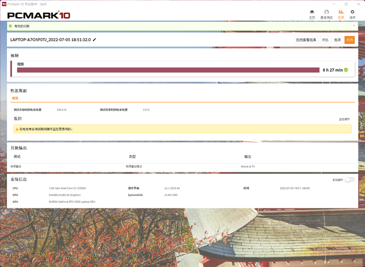 最终,这款轻薄本在PCMARK 10视频播放续航项目测试中,实现了8个小时27分钟的成绩。