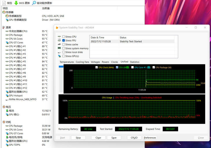 单烤处理器。开启FPU烤机10分钟之后,这款轻薄本的CPU温度稳定在了约94℃左右,性能核全核频率稳定在了约3.4GHz,此时CPU功耗约为53.6W。