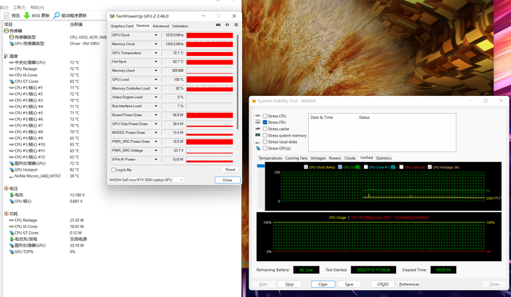 对处理器和显卡进行双烤。开启FPU+GPU烤机10分钟之后,这款轻薄本的CPU温度稳定在了约72℃左右,性能核全核频率稳定在了约2.1GHz,此时CPU功耗约为25W。GPU温度稳定在了约72℃左右,此时GPU功耗约为57W。