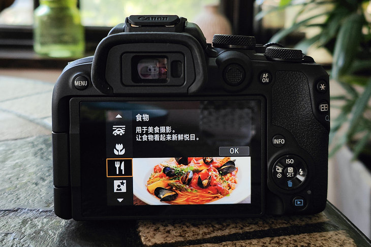 而拍摄不同的题材也不用费脑子想怎么设置光圈、快门等参数,可以按照想要拍摄的对象直接选择相应的场景模式,相机会自动调整相机的参数,比如选择“食物”场景后,相机会使用镜头的大光圈来拍摄,更好的突出美食这个主体,并且加强画面的色彩,让拍摄的食物更加美味诱人。