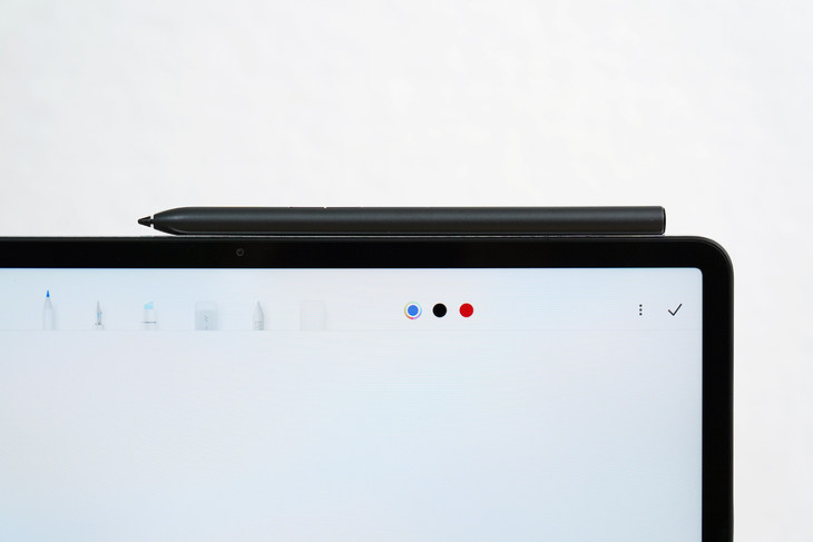 在边框上预留了触控笔的吸附区域,可以将触控笔牢牢的固定在边框上,方便需要时取用,而且当触控笔吸附在平板上时,也会进行充电,无需担心触控笔的续航问题。