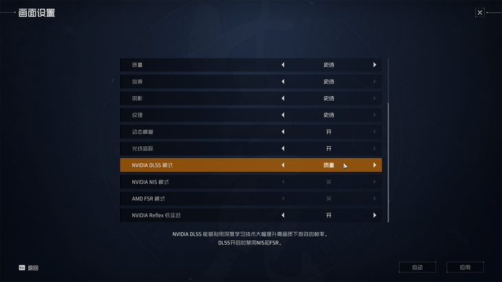 NVIDIA DLSS模式有关、质量、平衡、性能、超级性能这些选项。