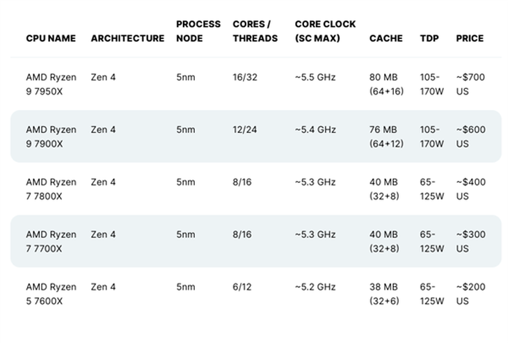 向下还有12核心的锐龙9 7900X、8核心的锐龙7 7800X/7700X、6核心的锐龙5 7600X。
