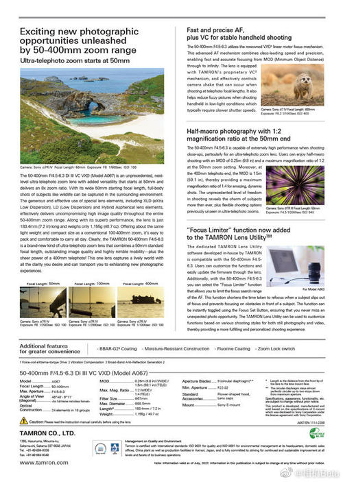 而就在近日网络上又曝光了遭泄露的50-400mm F4.5-6.3 Di III VC VXD的官方产品介绍,并列出镜头的最终规格,消息并指新镜将会在9月22日发布。50-400mm F4.5-6.3 Di III VC VXD使用了18组24片的光学结构,当中包括XLD超低色散镜片、LD低色散镜片及双面非球面镜片。新镜重1155g,镜长183.4mm,与传统的100-400mm镜头相当,但拥有更广阔的变焦范围,而且广角端由50mm标准焦距起跳,方便短焦距拍摄使用。腾龙50-400mm F4.5-6.3 Di III VC VXD还会用上腾龙专属设计的 VXD线性自动对焦马达,广角端的最近对焦距为0.25米,放大率为0.5x;而望远端400mm的最近对焦距离为1.5米,对应放大率也有0.25x,方便灵活运用焦距来得到主体的大特写。