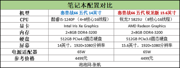 参加此次对比测试的笔记本电脑,笔者为酷睿i5-1240P一方选择的机型为惠普战66 五代 14英寸,为R7 5825U一方选择的机型为惠普战66五代 锐龙版 15.6英寸。这两款轻薄本目前在惠普京东自营旗舰店的售价均为4499元。