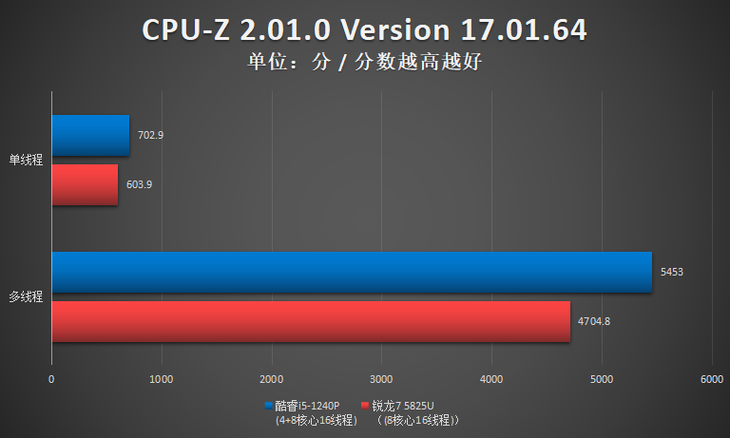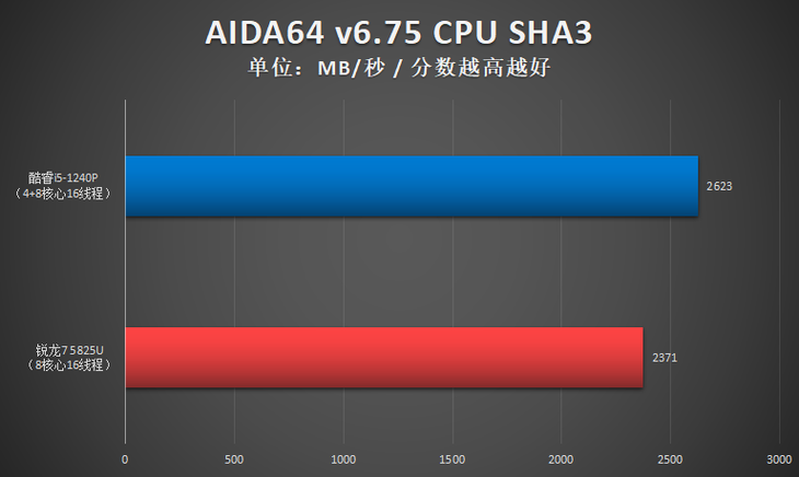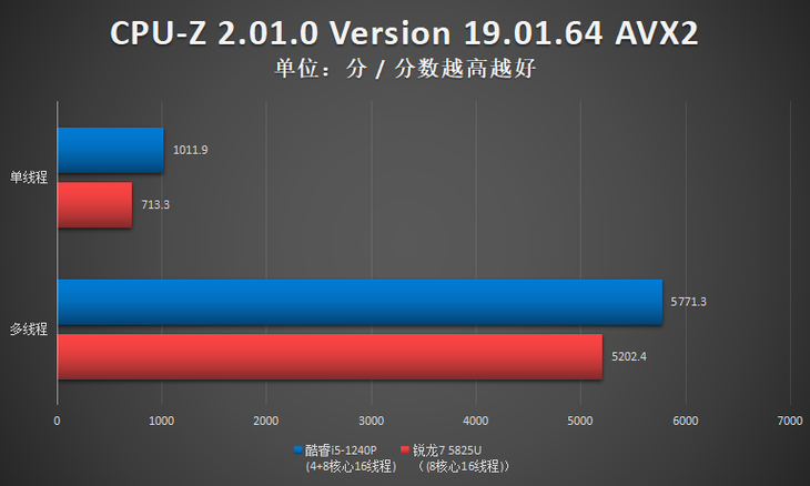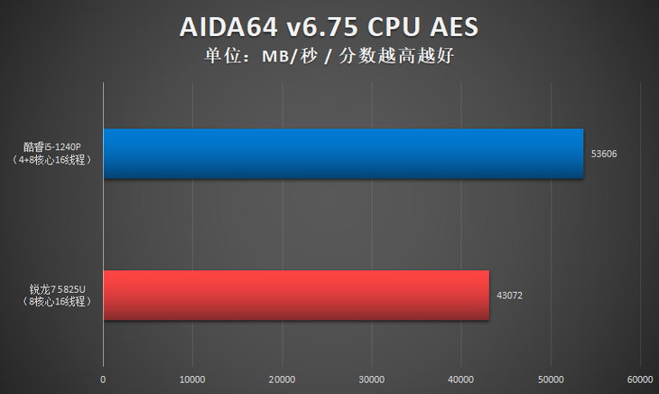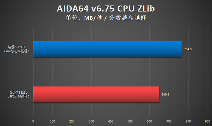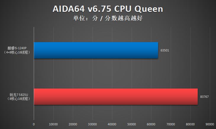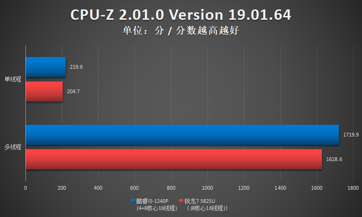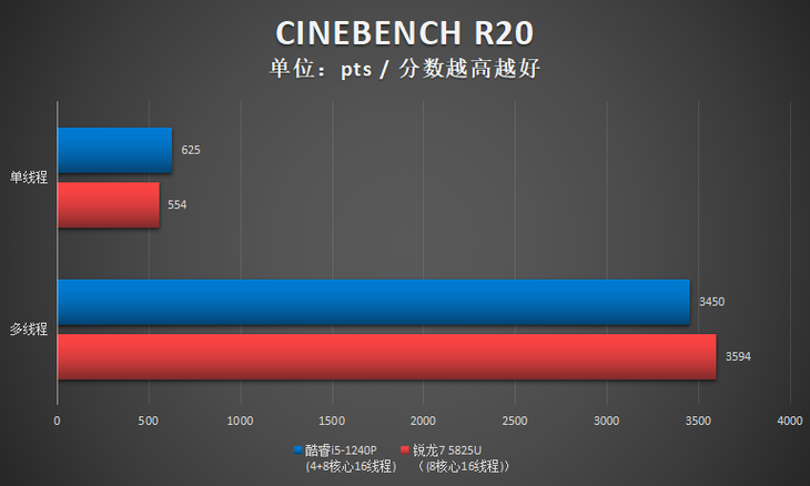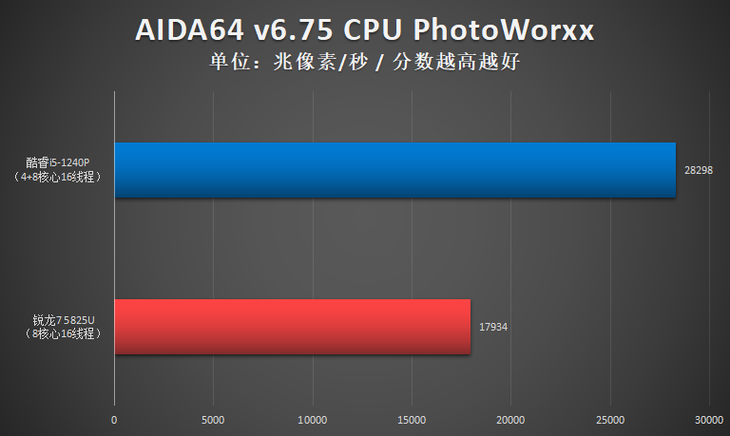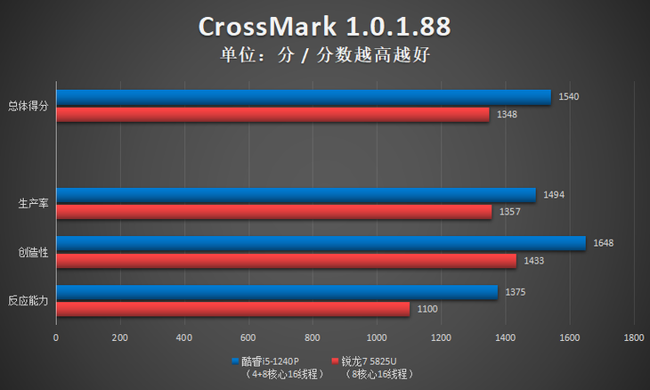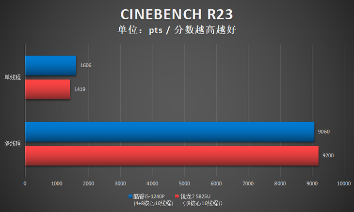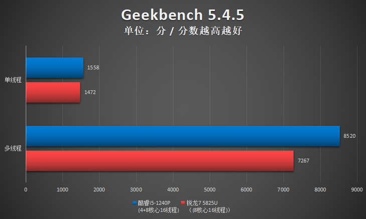 测试小结:此项测试,酷睿i5-1240P单核性能占优,R7 5825U多核性能占优。