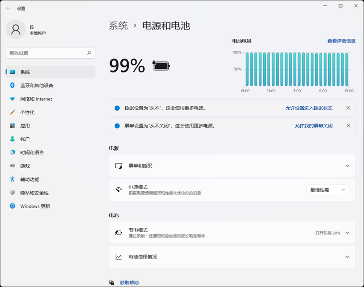 惠普战66机型的控制软件里面没有相关的性能模式切换选项。为了充分释放这两款轻薄本的性能,笔者在Win11系统里面的“电源和电池”界面下,将电源模式设置成最佳性能。