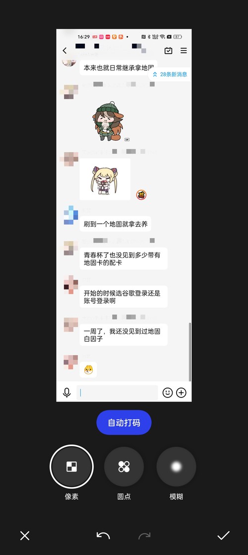 我们平时遇到分享聊天信息时,常常遇到需要对敏感信息打码的情况,但信息量很大的话打码过程也很是折磨。ColorOS 13的自动打码就能很好的解决这个问题。在微信、QQ等软件截图完成后,直接点进编辑页面就能一键给整张截图的群名称和人名头像都码掉,避免隐私的泄露。