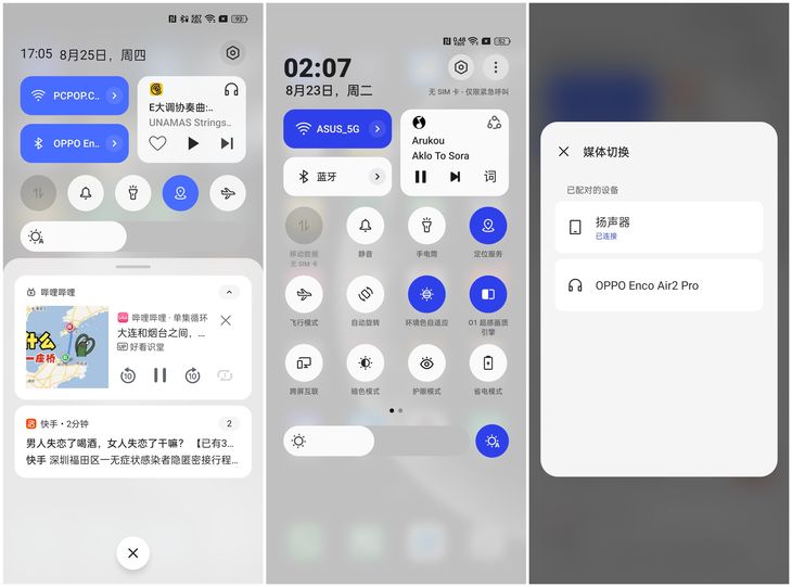 通知中心也进行了比较大的调整,通知与功能区域的划分更加清晰;右上角还新增了独立的音乐播放控件,切歌、暂停等操作不再占用通知区域,还能用它快速切换播放设备。