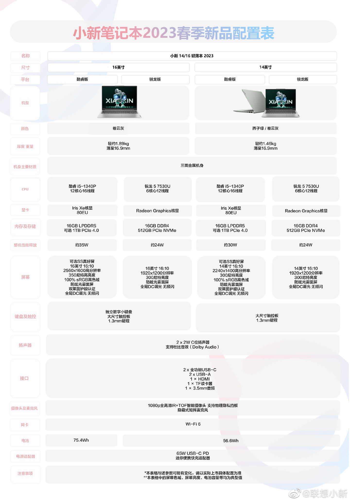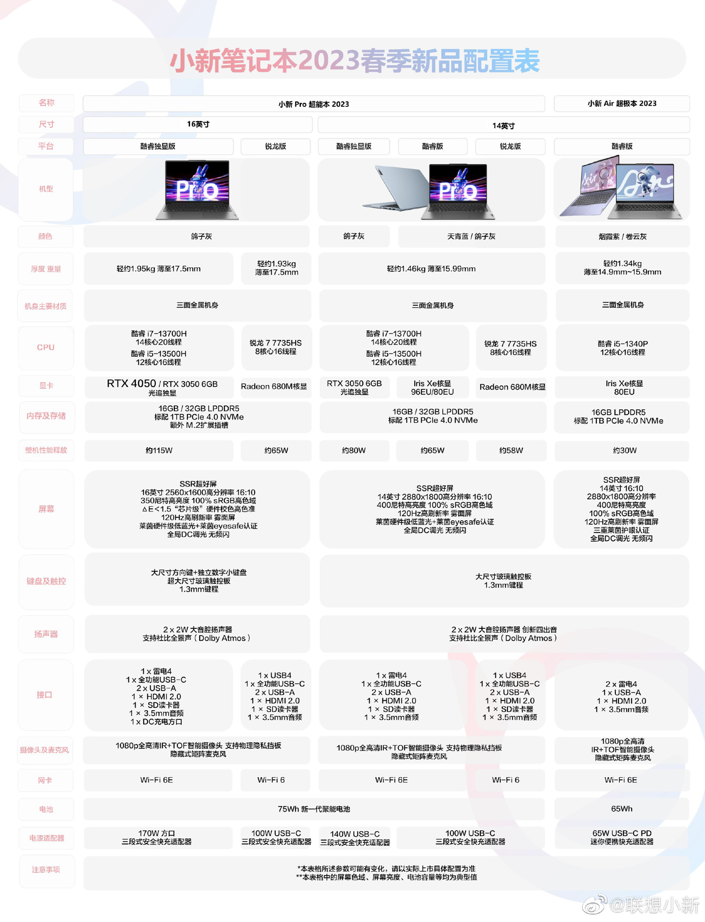 联想发布23款小新春季新品配置表,2月15日公布售价