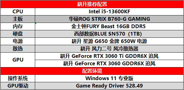 配置一为使用DLSS 技术畅玩1080P分辨率3A大作的推荐配置。CPU选用Intel i5-13600KF搭配 华硕ROG STRIX B760-G GAMING主板,内存使用的是 金士顿FURY Beast 16GB DDR5,这套基础配置能确保玩家能流畅运行市面上绝大部分3A游戏。散热方面选用的是 耕升 风力二号 风冷散热器,而硬盘选用的是 西部数据 BLUE SN570(1TB),这套选配也能满足绝大部分玩家的需求。显卡方面选用的是 耕升 GeForce RTX 3060 Ti GDDR6X 追风/耕升 GeForce RTX 3060 GDDR6X 追风 搭配 耕升 星源 G650 金牌 650W电源,如果玩家想进行后续升级可以选用 G850 金牌 850W电源。