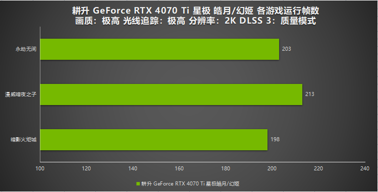 从游戏测试中,一共测试了三款不同的游戏,其中包括单机游戏与竞技游戏。可以看出的耕升 GeForce RTX 4070 Ti 星极皓月/幻姬在单机游戏和竞技游戏中的表现都不赖:在《永劫无间》中能跑到203帧,《漫威暗夜之子》中能跑213帧,在《暗影火炬城》中也能跑到198帧。这样的帧数足以在2K分辨率中畅玩该作,给玩家们带来流畅的游戏体验。同时,游戏中还支持开启光线追踪以及NVIDIA DLSS 3,为玩家们提供最真实的游戏画面以及最大幅度的性能提升。