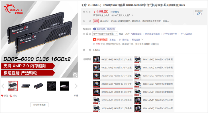 芝奇32GB(16Gx2)套装DDR5 6000频率台式机内存条-焰刃(黯夜黑)/C36,目前同样售价699元。