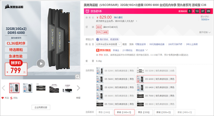 美商海盗船的DDR5-6000MHz 16G×2内存套装目前也不贵,32GB(16G×2)套装DDR5 6000台式机内存条复仇者系列游戏型C36目前降至799元。跌破700元指日可待!