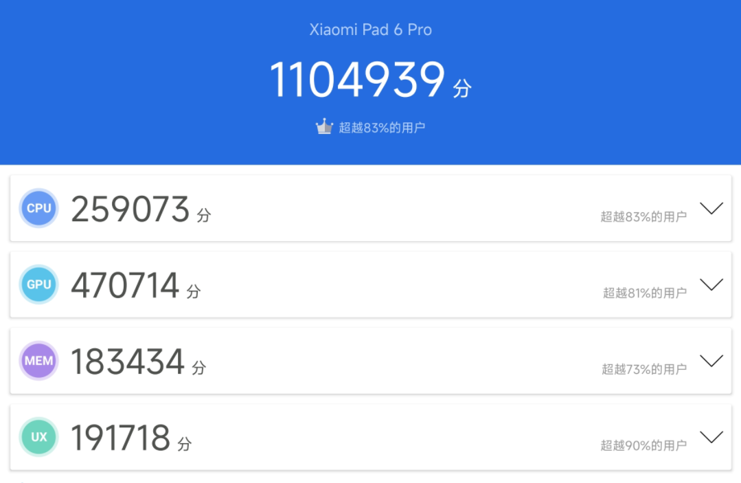 经过测试,小米平板6 Pro的安兔兔跑分也超过110万分。