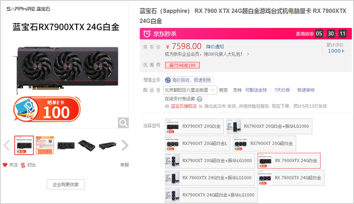 蓝宝石(Sapphire)RX 7900XTX 24G白金显卡,目前可叠加199元优惠券,到手价7399元。按照要求评论晒单还可返100元京东E卡。