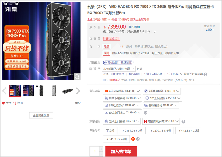 讯景(XFX)AMD RADEON RX 7900 XTX 24GB海外版Pro显卡,目前7399元。