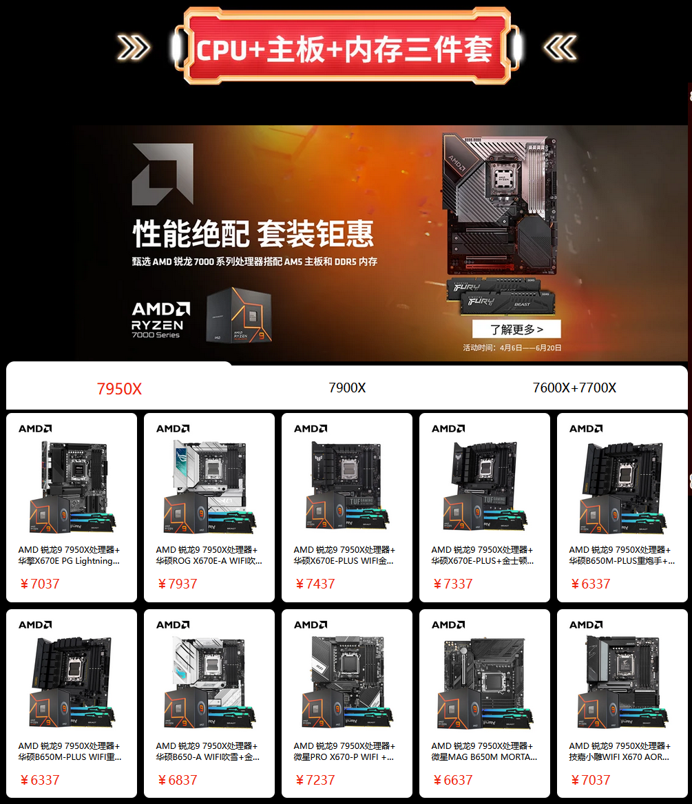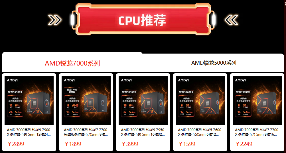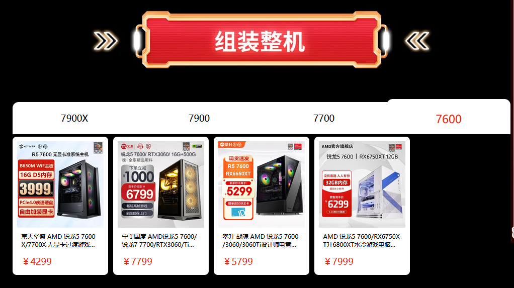 AMD京东自营旗舰店爆品抢购阶段还包含了多种DIY商品,不仅有最为热销的锐龙7000处理器单品,还有板U套装和CPU+主板+内存三件套装,让您一站式购齐直接搭建出全新的AM5平台战未来。当然还有各大装机品牌商使用锐龙处理器打造的整机产品,对于不熟悉攒机的小伙伴非常友好。当然活动页面还有更多DIY产品等待大家的挖掘,总有适合您的那一款。
