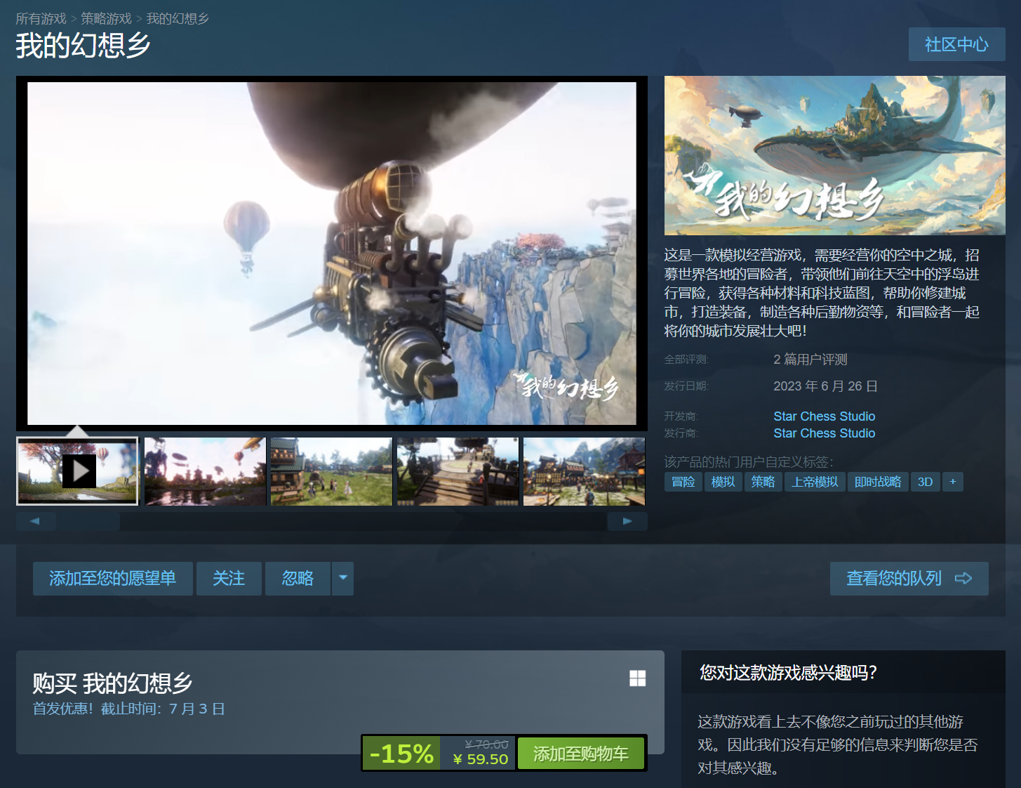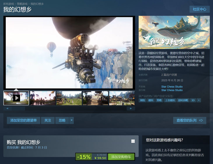国产游戏《我的幻想乡》现已登陆Steam平台,首发85折,到手价59.5元。