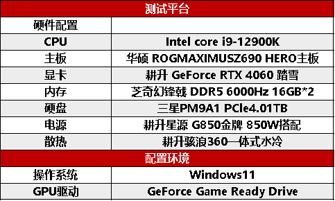 本次测试环节的CPU使用了Intel Core i9-12900K,主板方面选择了ROG MAXIMUS Z690 HERO主板,内存方面启用2条芝奇 幻锋戟 DDR5 6000Hz 16GB,电源采用的是 耕升 星源 G850金牌 850W,散热方面则是 耕升 骇浪360 一体式水冷,这套散热配置可以为GPU提供足够的降温以及供电 ,这套配置在正常使用中,可以发挥耕升 GeForce RTX 4060 踏雪的性能,同时本次测试将同时与GeForce RTX 3060 12GB和GeForce RTX 2060 进行直接比对,让我们来看看耕升 GeForce RTX 4060 踏雪 的优越表现吧。