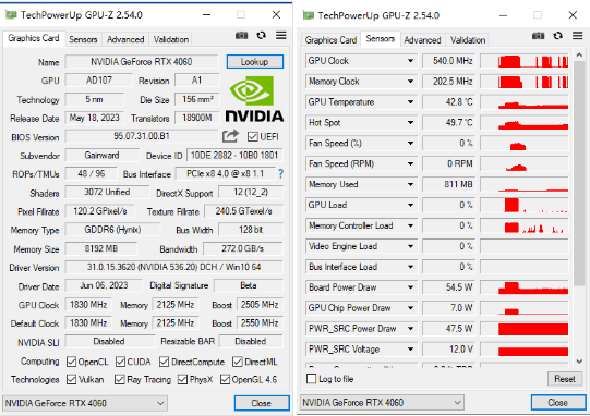 通过更新至新的GPU Z 2.5.4版本,玩家们可以得到耕升 GeForce RTX 4060 踏雪中更为具体的参数表现和实际规格,通过数据我们可以看到耕升 GeForce RTX 4060 踏雪的待机温度下温度为43.6°C,功耗为8.34W。