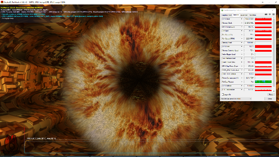 开启FurMark后,在长达20分钟的烤机后温度与功耗数据稳定,最终满载时其数据结果为满载功耗为113.4W,温度为64.1℃。在满载功耗的情况下,耕升 GeForce RTX 4060 踏雪的温度依旧能保持在稳定的状态,可想而知其散热性能的优良发挥。以及值得注意的是,其满载时所需要的功耗仅仅达到113.4W,极低的能耗保证了玩家们在日常使用时能够大幅度的降低电力上的消耗。在强大散热的加持下,GPU的温度提升幅度并没有很多。
