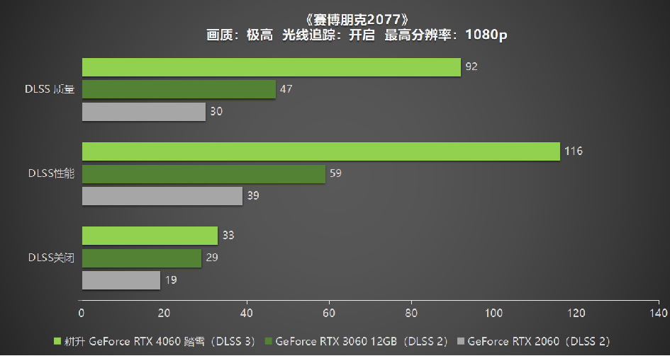 通过数据我们可以看到,在1080P分辨率下,耕升 GeForce RTX 4060 踏雪在未开启DLSS时,帧数来到了33帧,而GeForce RTX 3060和GeForce RTX 2060 则分别为 29帧和19帧。开启了DLSS 模式后,三张显卡之间就会有显著的差距,耕升 GeForce RTX 4060 踏雪开启DLSS 3性能模式的情况下,帧数来到了惊人的116帧。而在DLSS质量模式下,耕升 GeForce RTX 4060 踏雪在保证流畅的同时,画面的质量也有一定的提升,帧数也一同来到92帧。