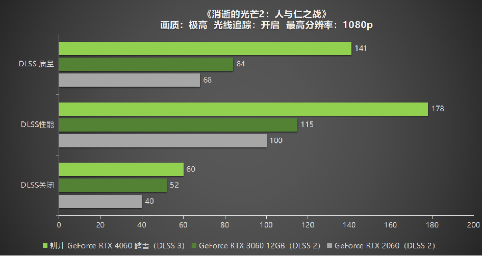 在1080P分辨率开启DLSS 性能模式下,GeForce RTX 3060 和GeForce RTX 2060 的帧率即可分别来到 115和100帧,在DLSS质量模式中GeForce RTX 3060 和GeForce RTX 2060 仍有84帧和68帧的流畅帧数。耕升 GeForce RTX 4060 踏雪在开启DLSS 3质量模式下帧率也来到了140帧, 在开启 DLSS 3 性能模式后帧率更是来到了178帧。耕升 GeForce RTX 4060 踏雪在开启DLSS 3的前后测试中,提升幅度高达150%,这样巨大的提升幅度可见 DLSS 技术对于游戏的体验优化相当重要。