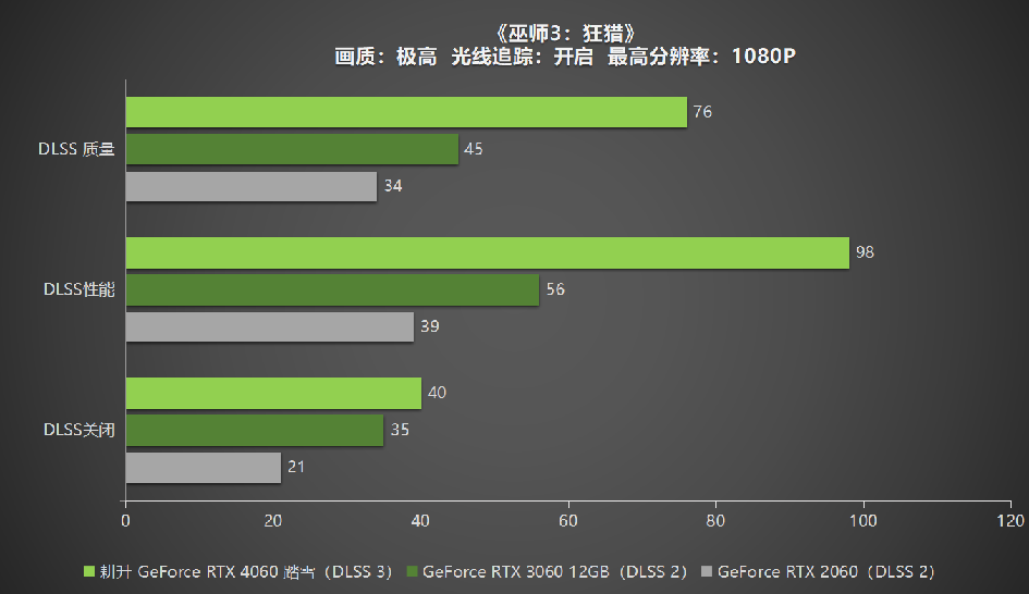 游戏对配置的基础要求并不算低,在关闭全部DLSS设置的情况下,耕升 GeForce RTX 4060 踏雪的运行帧率仅为40帧,GeForce RTX 3060 和GeForce RTX 2060 的帧率也分别仅有35帧和21帧。但在开启DLSS 的相关设置后,性能上将会有一个飞越性的提升。在开启DLSS 3性能模式的情况下,耕升 GeForce RTX 4060 追风的帧率将有巨大的提升,在DLSS 3质量模式下,显卡的帧率也一度来到了76帧。