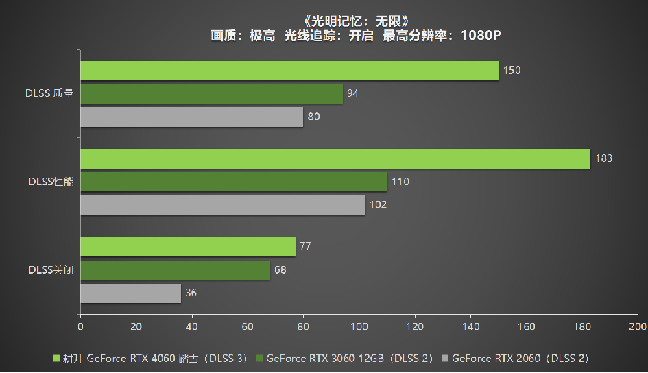接下来的游戏测试将通过耕升 GeForce RTX 4060 踏雪与GeForce RTX 3060和GeForce RTX 2060 三张显卡的游戏数据进行比对。本次测试的游戏中《赛博朋克 2077》、《消逝的光芒2:人与仁之战》、《霍格沃茨之遗》、《光明记忆:无限》、以及《巫师3:狂猎》在1080P 分辨率下进行测试,同时测试中将开启最 高等级的光线追踪设置、关闭垂直同步以及设置为最 高画质,对比数据上使用DLSS 关闭,DLSS 质量模式 和DLSS 性能模式进行测试。测试《无畏契约》时,则测试1080P和4K的分辨率的帧数比对,以及玩家在开启Reflex 下的系统延迟表现。 耕升 GeForce RTX 4060 踏雪在测试中将采用NVIDIA DLSS 3技术,GeForce RTX 3060和GeForce RTX 2060 则使用NVIDIA DLSS 2技术。