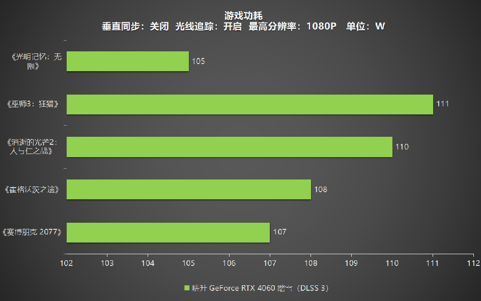以上数据是五款游戏所产生的实时游戏运行功耗,耕升 GeForce RTX 4060 踏雪的整体游戏平均功耗十分接近110W。在这个功率下显卡运转,不仅可以让显卡时刻趋于稳定的状态,而且可以令玩家们可以节省许多的能源上的耗能。耕升 GeForce RTX 4060 踏雪真正做到了高产出、低耗能的实际体验。