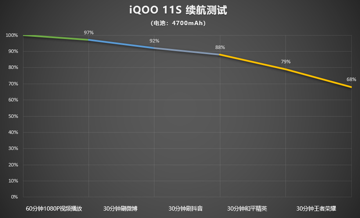 在实际的测试上,iQOO 11S可以在默认情况下于19分钟内补充完手机的电量,如果进一步开启到设置内的超快充电模式,则可将时间进一步拉短到12分钟左右,在碎片化时间里带来极快的电量补充。而iQOO 11S在三小时的续航测试中,最终的剩余电量为68%,对于大部分的用户来说,一整天的使用是不在话下的。