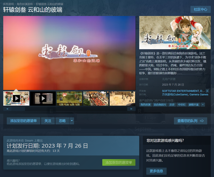 《轩辕剑三:云和山的彼端》预计7月26日登陆Steam