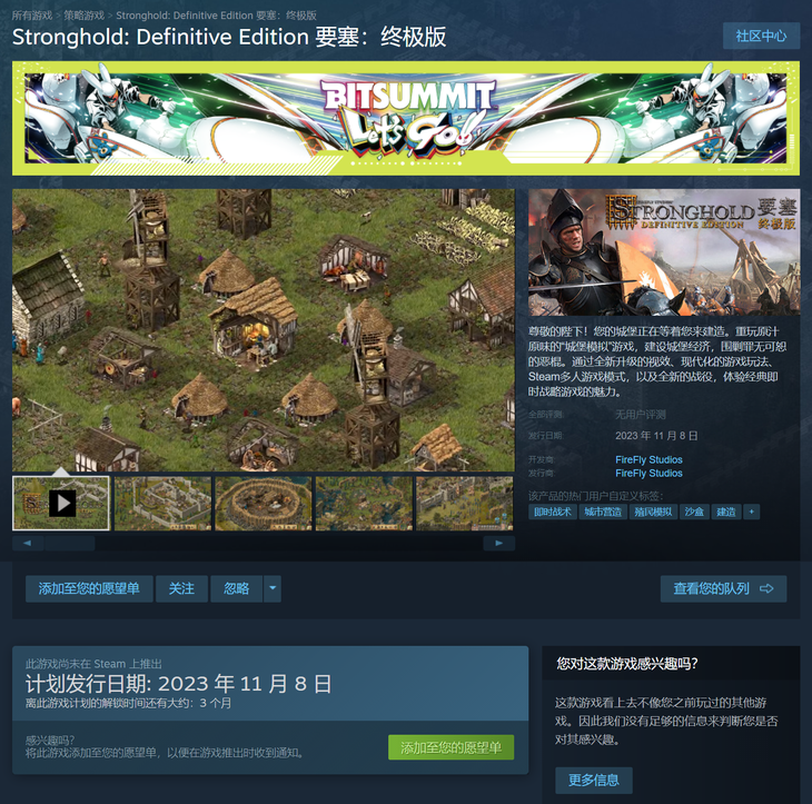 《要塞:终极版(Stronghold: Definitive Edition)》预计将于11月8日发售,感兴趣的玩家们届时可以前往Steam游戏平台购买畅玩。