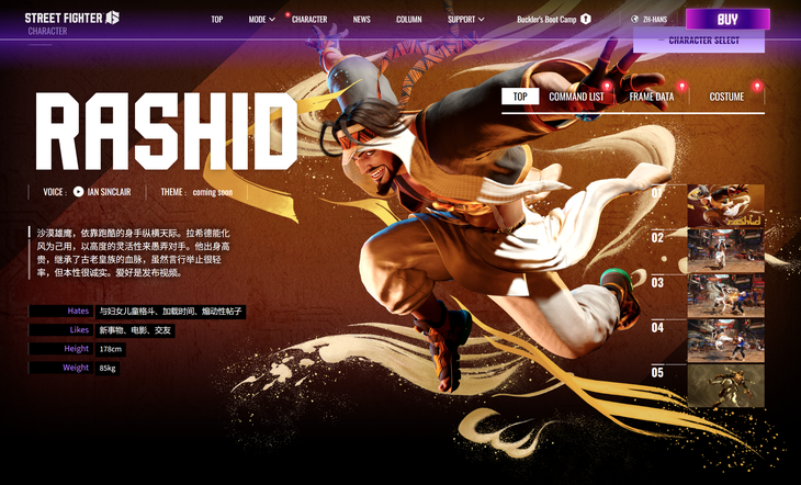 《街头霸王6》新角色拉希德现已上线。沙漠荒鹫拉希德依靠跑酷的身手纵横天际。他能化风为己用,以灵活的身手來愚弄对手。他出身高贵,集成了古老皇族的血派。虽然言行举止轻率,但本性诚实。兴趣爱好是发布影片。