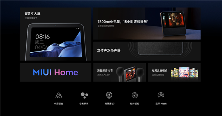 据了解,小米智能家庭屏 Pro 8配备一块8英寸大屏,分辨率为1280*800,支持90°-120°屏幕仰角无级调节。得益于内置的7500mAh大电池,小米智能家庭屏 Pro 8成为移动家庭中控神器,在电池完全充满情况下,最长可使用15个小时。小米智能家庭屏 Pro 8搭载最 新MIUI Home系统,首屏为智能家居中控界面,按场景、房间类型展示全屋状态,照明、环境、插座开关、监控、窗帘等,全屋设备可在一屏调控。