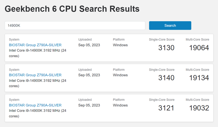 通过目前收录的3次测试成绩来看,酷睿i9-14900K单核心成绩约为3100多分,多核心成绩约为19000多分。