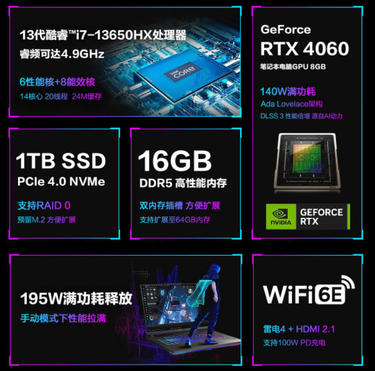显卡方面则是配备的140W满功耗版RTX4060,采用NVIDIA Ada Lovelace架构以及第四代Tensor核心,支持DLSS 3以及AV1编码格式,在游戏以及视频创作方面,体验升级更加明显。