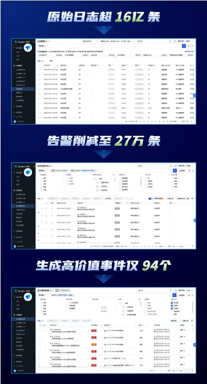 “在近一个月的测试期间,深信服XDR平台共产生1615875443个安全日志,聚合而成278802个安全告警,最终生成94个安全事件,告警削减效率提升2965倍。每位安全运营人员每天仅能处理500条告警,以往10+人花费10+天都处理不完,现在1人1天即可高质量研判完所有安全事件,安全告警结合威胁定性,可以将非病毒和扫描类的研判完毕。”