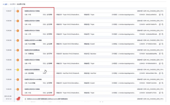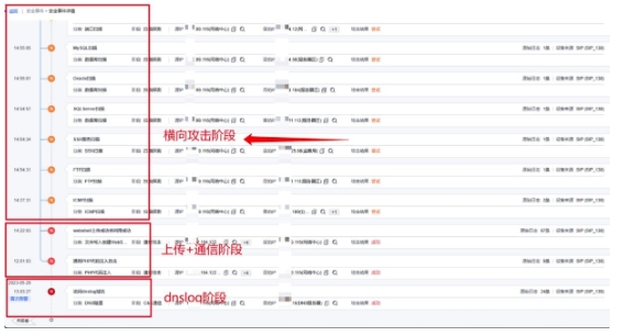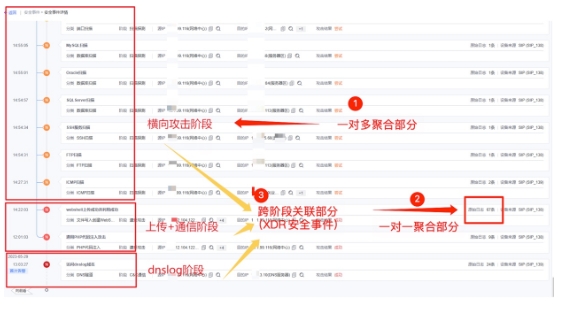 跨阶段关联降噪:将早期dnslog、WebShell上传+通信、内网横向等攻击,跨阶段关联在一起,深信服XDR以自动化方式,聚合成一个完整的安全事件。
