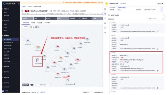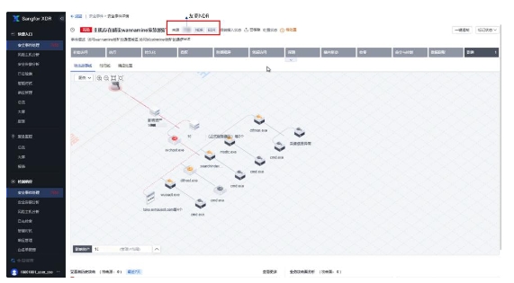 传统病毒查杀+高级威胁降噪:如果黑客进行一系列高级威胁攻击行为后,仍然落盘了一个可疑文件,被EDR杀毒检出,深信服XDR会将杀毒告警在进程链进行匹配,意味着传统病毒查杀和高级威胁降噪合二为一。