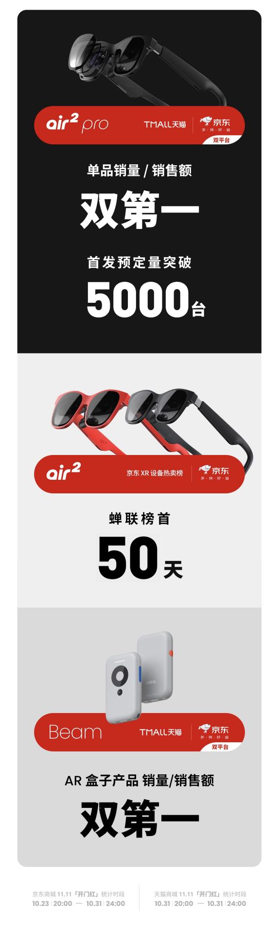 XREAL Air 2 Pro双11首发战绩:单品销量&销售额 双料冠军!