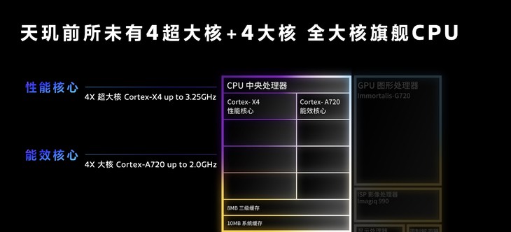 天玑9300采用了4+4全大核的设计,由4个Cortex-X4超大核以及4个Cortex-A720大核组成,其中4颗超大核中,1颗主频达到了3.25GHz,另外3颗主频为2.85GHz。4颗大核的主频为2.0GHz。