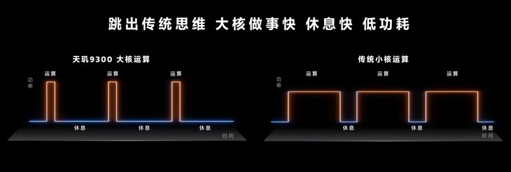 全大核架构工作速度快、效率高,具有高能效特性,无论在轻载还是重载应用场景中,都能降低功耗、延长续航时间。天玑9300其峰值性能相较上一代提升40%,功耗节省33%。